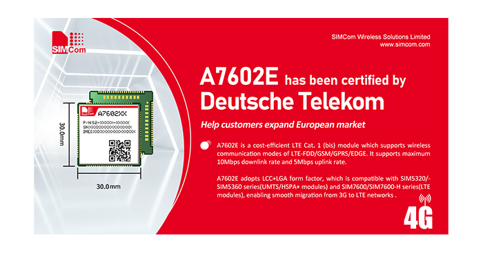 The SIMCom LTE Cat.1(bis) module A7602E has been certified by Deutsche Telekom