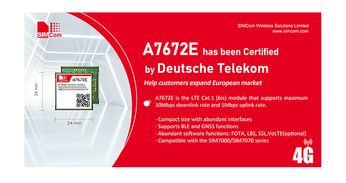 SIMCom LTE Cat.1(bis) module A7672E has been certified by Deutsche Telekom