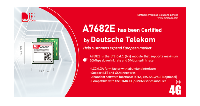 SIMCom LTE Cat.1(bis) module A7682E has been certified by Deutsche Telekom