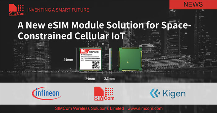 SIMCom, the leading designer and manufacturer of Machine-to-Machine (M2M) wireless modules and solutions, announced that the SIMCom NB-IoT SIM7070 module measuring only 24 mm x 24 mm can now be equipped with a compact eSIM security controller from Infineon powered by GSMA-compliant remote SIM management software provided by Kigen (UK) Ltd. The security controller comes in the smallest SMD package, significantly smaller than the standard currently established.