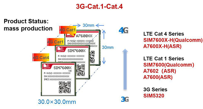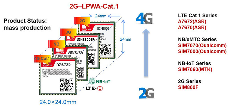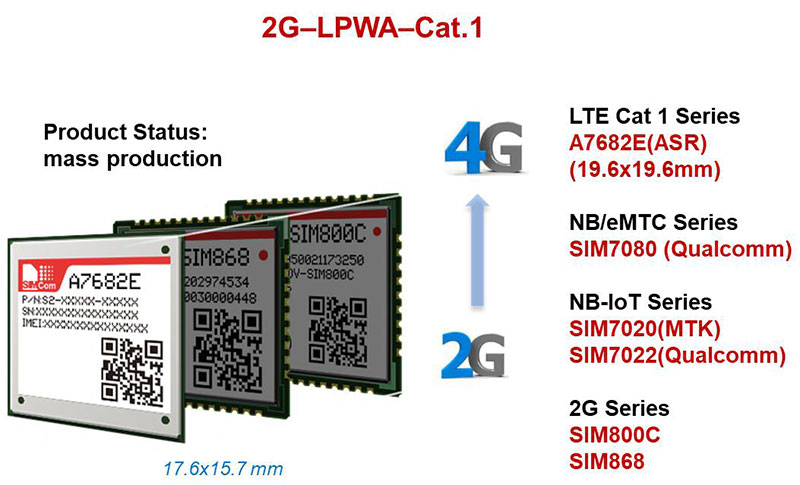 LTE Cat.1 is a lower cost solution which is designed for more feature-rich IoT applications, it can support data streaming and full mobility. SIMCom has developed a battery of Cat.1 modules such as A7672, A7670, A7682E, SIM7600 and etc. SIMCom Cat.1 module A7670 、A7672 and NB-IoT module SIM7060 are pin to pin SIMCom’s 2G classical module SIM800F,which enables short time-to-market and reduces development cost for customers.