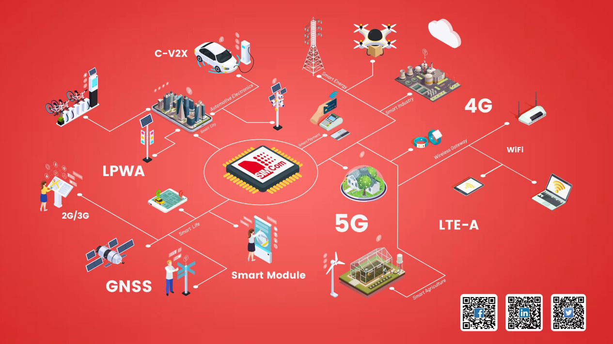 To meet the needs of ever increasing IoT applications and fast development of wireless communication technologies, SIMCom has developed a diversified product roadmap including 2G,3G,4G,5G,LPWA,GNSS modules, automotive modules and smart modules. SIMCom modules cover various vertical IoT segments such as smart energy, smart automotive, smart payment, telehealth, smart city, telematics, smart industry and smart agriculture.