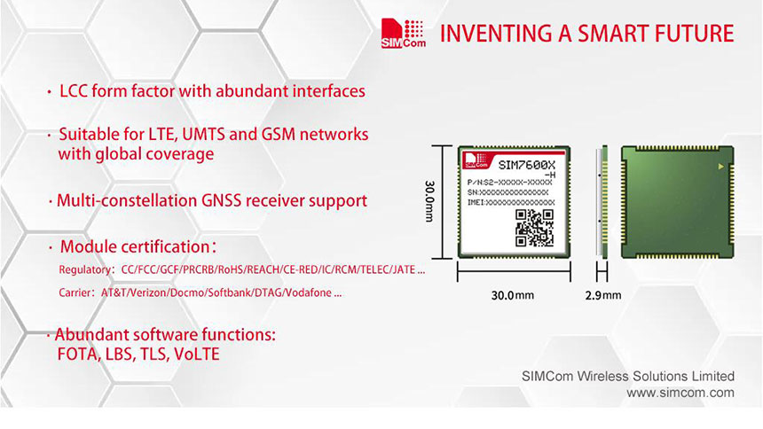 SIM7600X-H series support the networks of LTE, UMTS and GSM with global coverage,which can help traditional commercial vehicles to access the cloud at high speed via 4G network. The SIM7600X-H seriesalsosupport wireless communication modes of LTE-TDD/ LTE-FDD/HSPA+/GSM/GPRS/EDGE etc. Even if a vehicle passes through an area that cannot be connected to a 4G network, it will fallback3G and 2G toguarantee communication connection as much as possible.