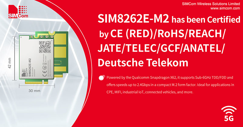 SIMCom, a global leader in IoT communication solutions, is proud to announce that its 5G R16 module SIM8262E-M2 has received a wide range of international certifications, including CE (RED), RoHS, REACH, JATE, TELEC, GCF, ANATEL, and Deutsche Telekom approval. These certifications reinforce SIMCom’s commitment to global market and accelerate the adoption of 3GPP Release 16 5G devices across the world.