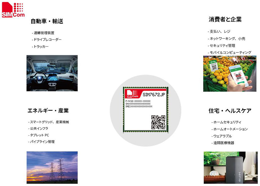 With support for Power Saving Mode (PSM), the SIM7672JP enables long-term, low-power deployments—making it an ideal solution for diverse sectors such as automotive and transport (fleet management, UBI, DVR, public safety), energy and industrial (smart grids, industrial equipment, rugged tablets, infrastructure, pipeline monitoring), consumer and enterprise (payment systems, POS, networking, retail, surveillance), and residential and healthcare (home automation, security, wearables, remote medical devices).