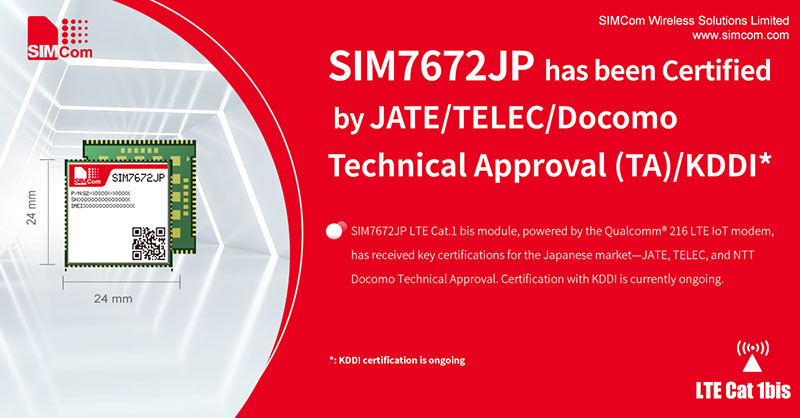 SIMCom, a global leader in IoT communication solutions, announces that its SIM7672JP—powered by the Qualcomm® 216 LTE IoT modem—has successfully obtained key certifications for the Japanese market, including JATE, TELEC, and NTT Docomo Technical Approval (TA). Certification with KDDI is currently ongoing.